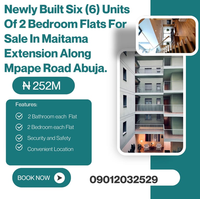 Secure a promising investment in a rapidly developing area. We are pleased to present six (6) newly constructed 2-bedroom apartments, strategically located in Maitama Extension along Mpape Road.